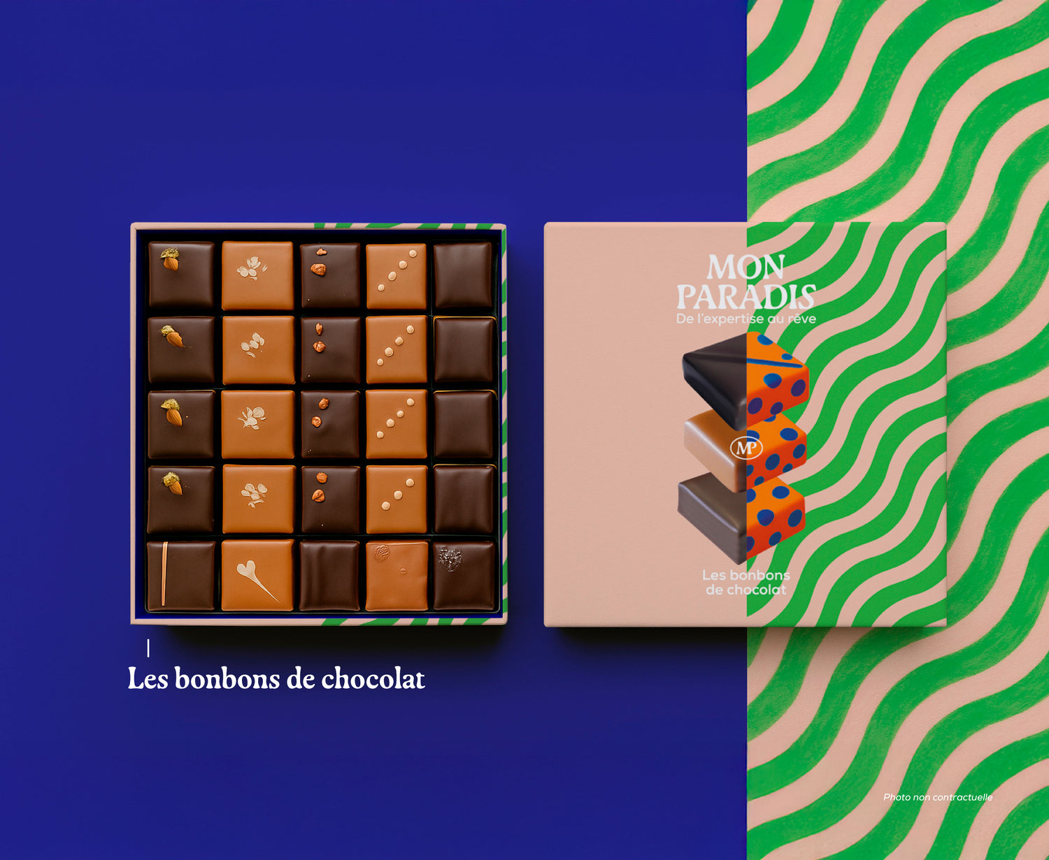 Découvrez un assortiment de 25 bonbons de chocolat composé de 12 créations uniques, noirs et laits.