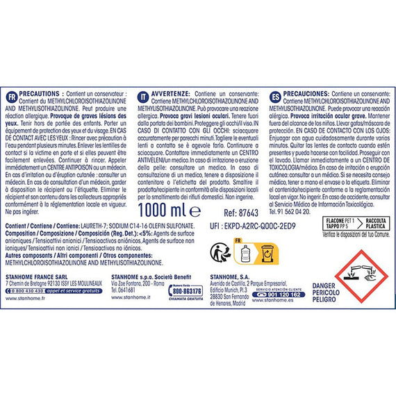 DANGER : Provoque de graves lésions des yeux. Contient un conservateur. Contient un mélange de : METHYLCHLOROISITHIAZOLINONE, METHYLISOTHIAZOLINONE. Peut produire une réaction allergique. Dangereux. Respecter les précautions d’emploi.