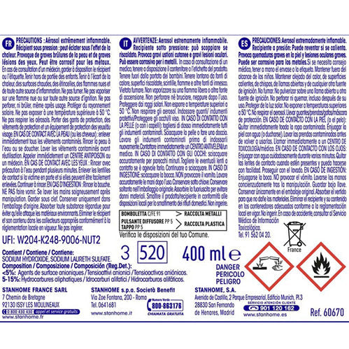 DANGER : Aérosol extrêmement inflammable. Récipient sous pression. Peut éclater sous l’effet de la chaleur. Peut être corrosif pour les métaux. Provoque de graves brûlures de la peau et de graves lésions des yeux. Respecter les précautions d’emploi.
