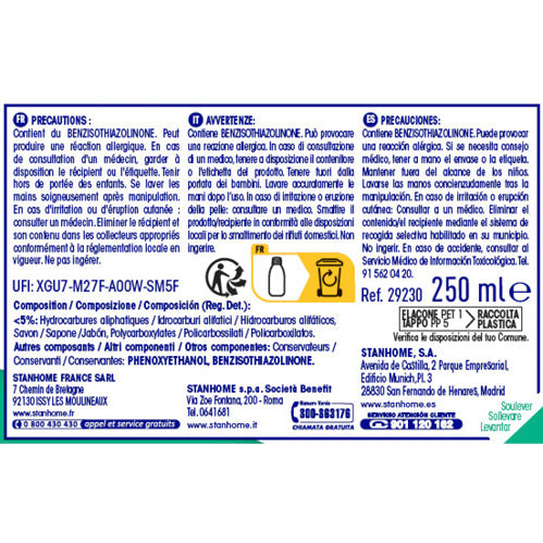 ATTENTION : Contient du mélange de: 5-chloro-2-méthyl-4-isothiazolin-3-one [No. CE 247-500-7] et 2-méthyl-4-isothiazolin-3-one [No. CE 220-239-6] (3:1). Peut produire une réaction allergique. Liquide et vapeurs inflammables. Provoque une sévère irritation des yeux. Nocif pour les organismes aquatiques, entraîne des effets néfastes à long terme. Respecter les précautions d'emploi.