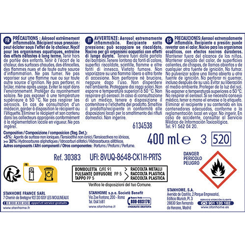 DANGER : Aérosol extrêmement inflammable. Récipient sous pression. Peut éclater sous l'effet de la chaleur. Nocif pour les organismes aquatiques, entraîne des effets néfastes à long terme. Respecter les précautions d'emploi.