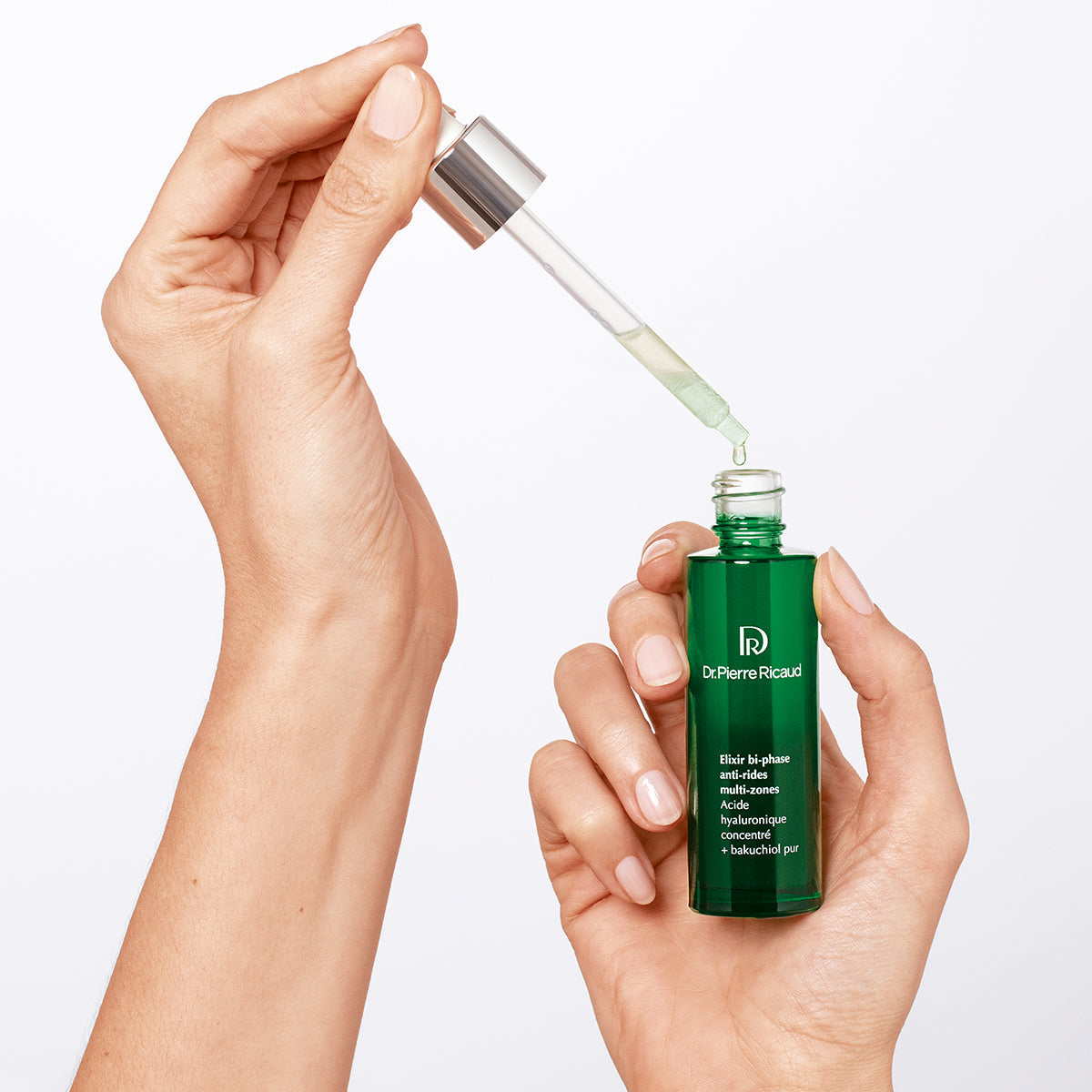 Cet élixir bi-phase SOS agit immédiatement pour lisser les rides et affiner le grain de peau, offrant un effet de lissage instantané. En seulement 7 jours***, il réduit visiblement les rides, pour une peau plus lisse et rajeunie. Sa texture bi-phase unique, adaptée à tous les types de peau, combine les bienfaits de deux phases complémentaires pour une action anti-âge optimale. Ce soin multi-zones agit sur les rides et signes de l’âge sur le visage, le contour des yeux, le cou et le décolleté.