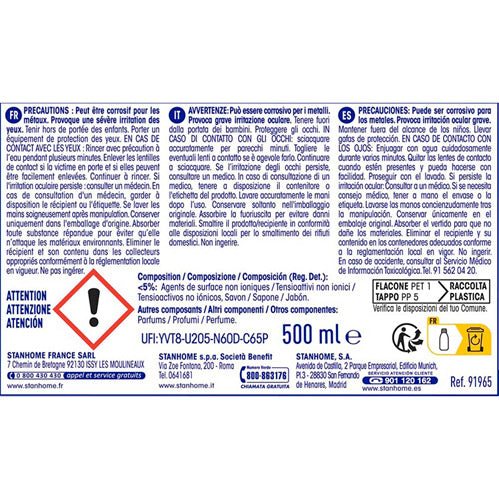 Avant la première utilisation, remplacer le bouchon par le Trigger Stanhome afn d’obtenir un flacon spray. Tourner l’embout du trigger en position ON. Vaporiser directement à plus de 20 cm de la surface à nettoyer. Frotter puis essuyer avec une éponge ou un chifon humide. Rincer abondamment à l’eau potable. Après utilisation, repositionner l’embout du trigger en position OFF.