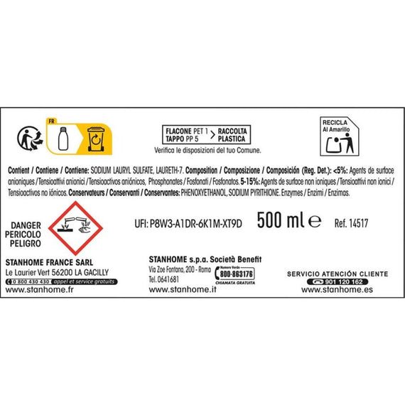 Avant la première utilisation, remplacer le bouchon par le Trigger Pre Wash STANHOME afin d’obtenir un flacon spray. Tourner l’embout du Trigger en position ON. Vaporiser le produit à 15 cm du linge sur les zones à détacher, tout en gardant le tissu éloigné. Après 1 à 2 minutes, mettre le linge dans le lave-linge et démarrer le programme.