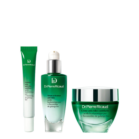 Sérum activateur : Le Sérum activateur anti-rides agit rapidement pour atténuer rides et ridules. Son application sous la crème augmente la pénétration des actifs**. Enrichi en acide hyaluronique pur et en flavonoïdes de galanga bio, ce sérum anti-rides offre une solution efficace pour réduire les rides, procurant une peau lisse et comblée. L'acide hyaluronique pur procure une sensation de peau lissée immédiate, tandis que les flavonoïdes de galanga bio stimulent la synthèse d'acide hyaluronique à haut poids moléculaire de l’intérieur, comblant ainsi les rides. Utilisé en complément de la crème, ce sérum constitue une approche complète pour une peau régénérée, visiblement plus jeune et rayonnante.