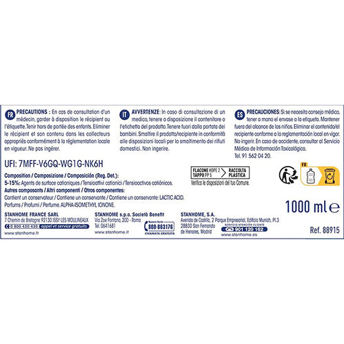 Utiliser dans la dernière eau de rinçage. Diluer la quantité indiquée sur l’étiquette du produit dans 8L d’eau. Laisser tremper. Essorer sans tordre. Veiller à bien se laver les mains avec de l’eau et du savon après chaque utilisation.